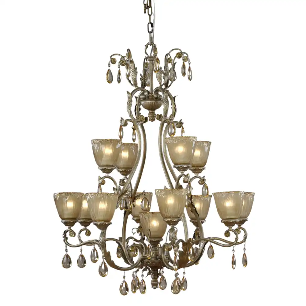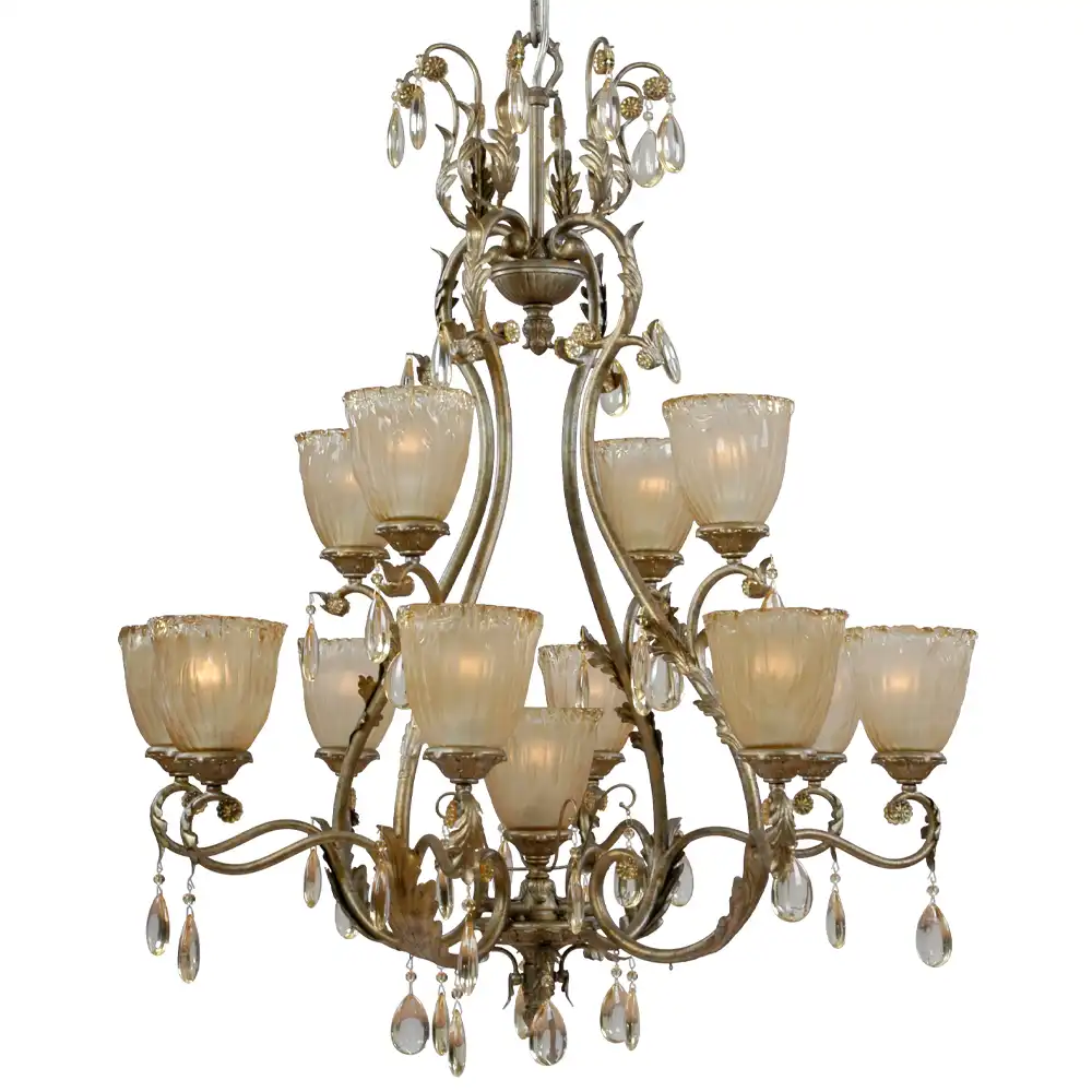 Handcrafted 13-Light Two-Tier Chandelier with champagne-silver finish, frosted floral glass shades, ornate leaves, and crystal pendants. Designed for OEM/ODM wholesale customization.