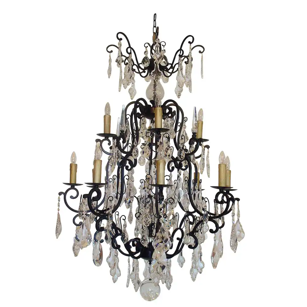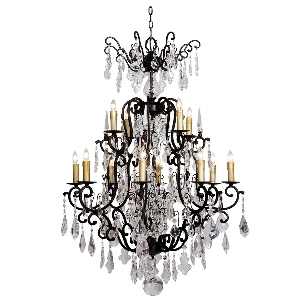 This grand 2-tier 12-light chandelier showcases the perfect balance of strength, artistry, and opulence. Expertly handcrafted from high-strength metal, the frame features an elegant black iron finish with subtle matte undertones, offering a refined contrast to the brilliance of its crystal adornments. The finish has a smooth, wrought-iron character, designed to complement both classical and transitional interiors.