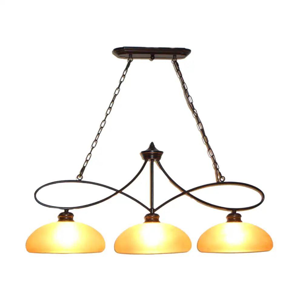 Three gracefully arched metal stems form an infinity-inspired silhouette, harmoniously supporting the amber-tinted glass shades that emit a soft, ambient glow. The deep bronze finish, with its smooth matte texture and hand-applied highlights, adds depth and vintage appeal to any interior — ideal for hospitality, dining, or residential applications seeking both charm and durability.