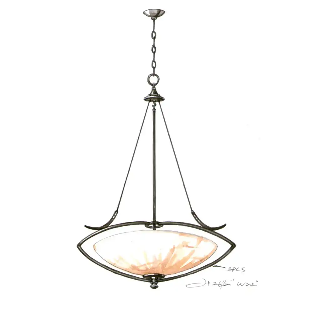 From the canopy, a slender central stem anchors the pendant, complemented by gracefully arched suspension arms that form an open elliptical frame. These flowing contours give the fixture an airy, architectural character, balancing strength with delicacy. The elliptical frame doubles as both support and ornament, creating a dynamic silhouette that elevates the fixture from functional lighting to a statement piece of interior art.