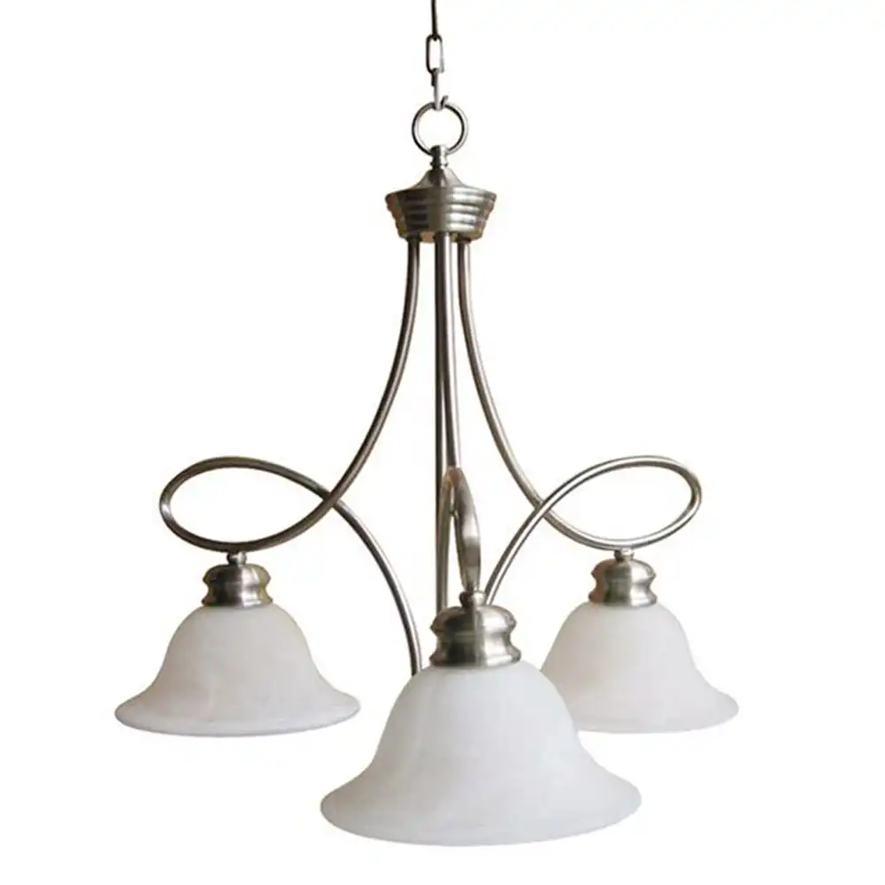 This 3-Light Satin Nickel Pendant Fixture combines modern refinement with enduring craftsmanship. Constructed from high-strength metal with a stable framework, it features a sleek satin nickel finish that enhances contemporary interiors with its soft metallic sheen. The gently curved welded stems create an elegant silhouette, while the frosted glass bell shades diffuse light into a warm, balanced glow, making it ideal for dining spaces, living areas, or hospitality applications.