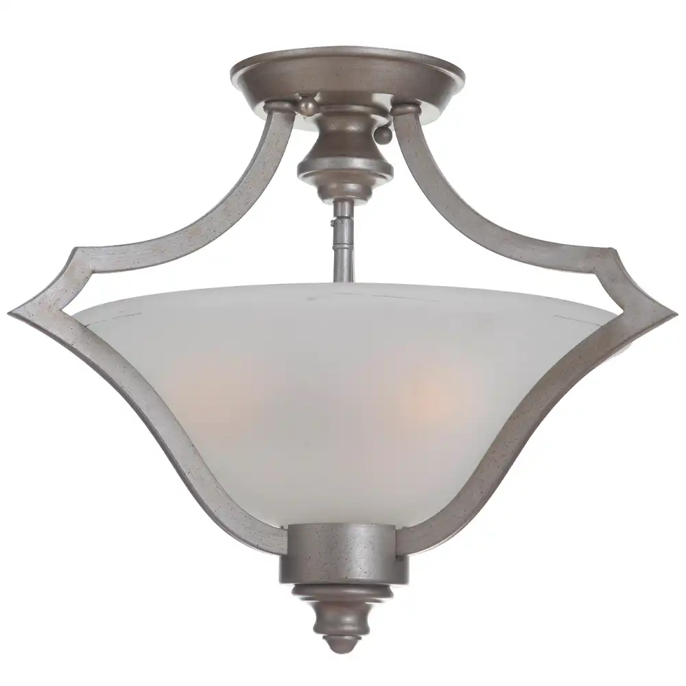 Elegant 3-light semi-flush mount ceiling light with brushed antique silver finish, frosted glass shade, and decorative frame design. Perfect for OEM/ODM wholesale decorative lighting projects.