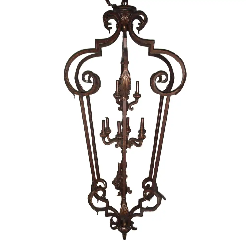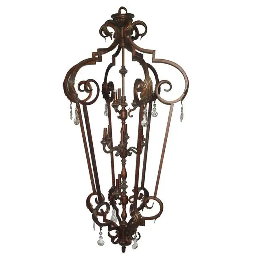 Exquisite scrollwork arms and ornate detailing showcase the artistry of wrought metal, while delicate hanging crystal accents catch the light, adding a touch of elegance and sparkle. Designed for grand foyers, ballrooms, dining halls, and luxury hospitality spaces, this chandelier is not only a light source but also a centerpiece of architectural beauty.
