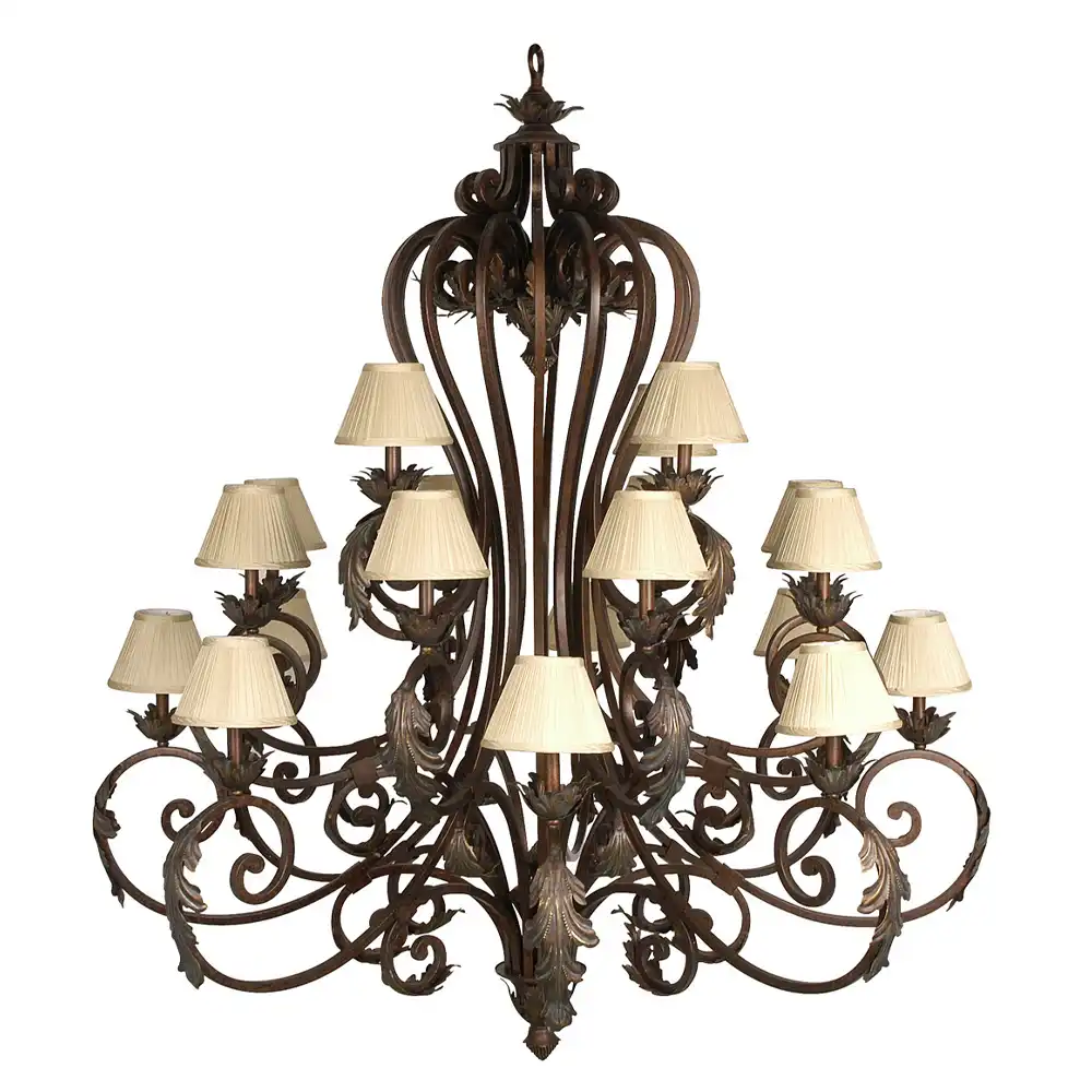 The chandelier’s three-tier composition showcases exquisite balance and symmetry: the upper tier supports 4 lights, the middle tier holds 8, and the lower tier completes the design with another 8 lights. Each arm is adorned with elegant scrollwork and intricate leaf motifs, revealing the skill and attention to detail of experienced artisans. The pleated fabric lampshades diffuse light softly, casting a warm, inviting glow ideal for luxurious residential or hospitality interiors.