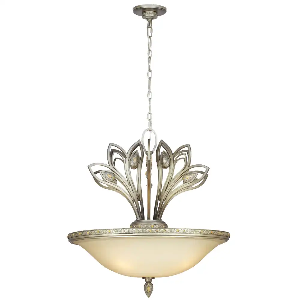 The chandelier’s body supports four light holders, fully encased within a broad inverted-bowl amber frosted glass lampshade. The lampshade’s rim is finely ornamented with an engraved repeating heart-and-scroll pattern, further accented by small oval crystal inlays. The glass is center-locked to the vertical stem and finished with an ornamental finial beneath: a teardrop-shaped drop decorated with engraved detailing and a central oval crystal inset, echoing the motif above.