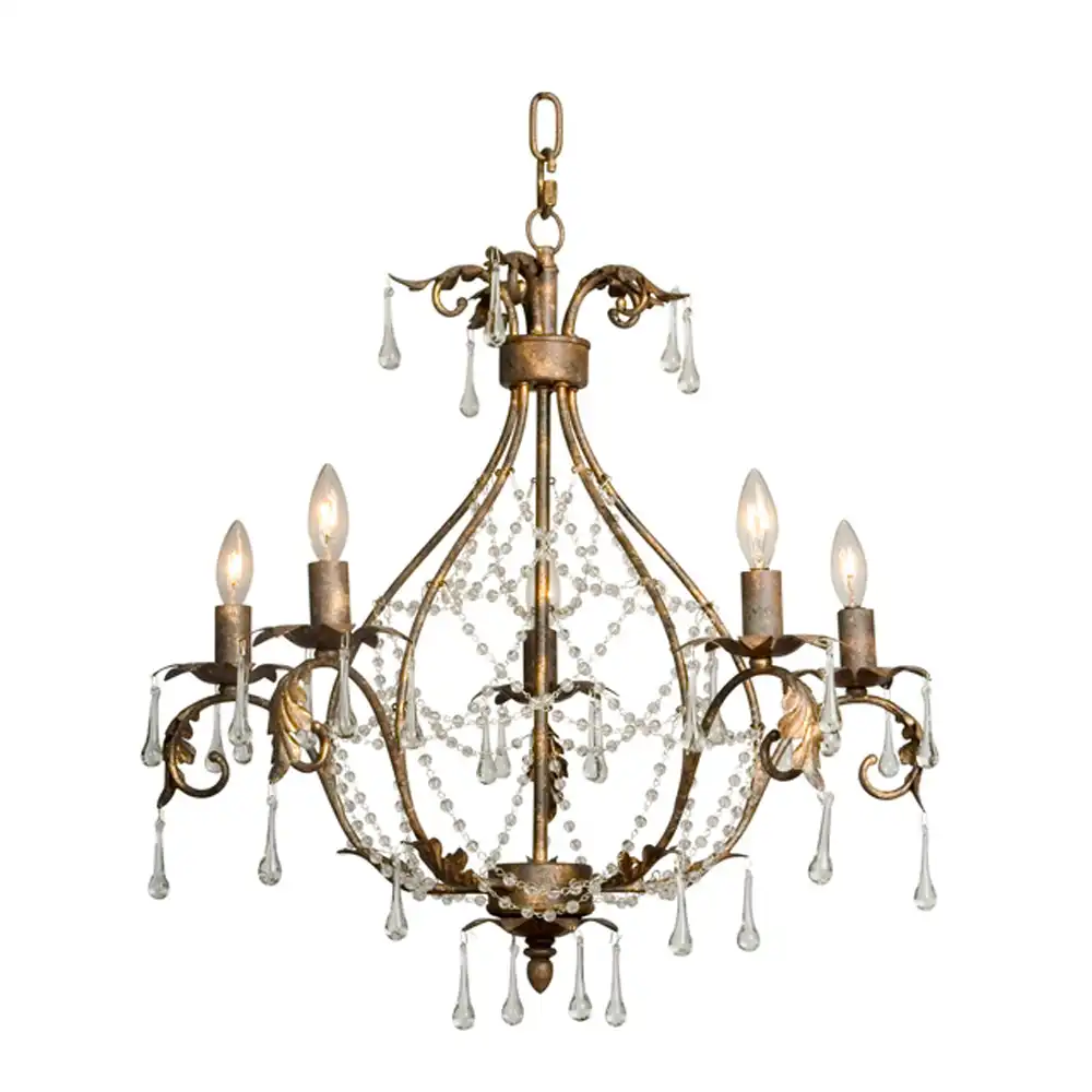 Its gracefully curved frame forms a delicate open cage silhouette adorned with hand-strung crystal bead garlands and teardrop pendants, creating a play of light and texture that enhances any refined interior. Five candle-style lights rise elegantly from intricately detailed arms, providing a warm, romantic glow reminiscent of Old World charm.