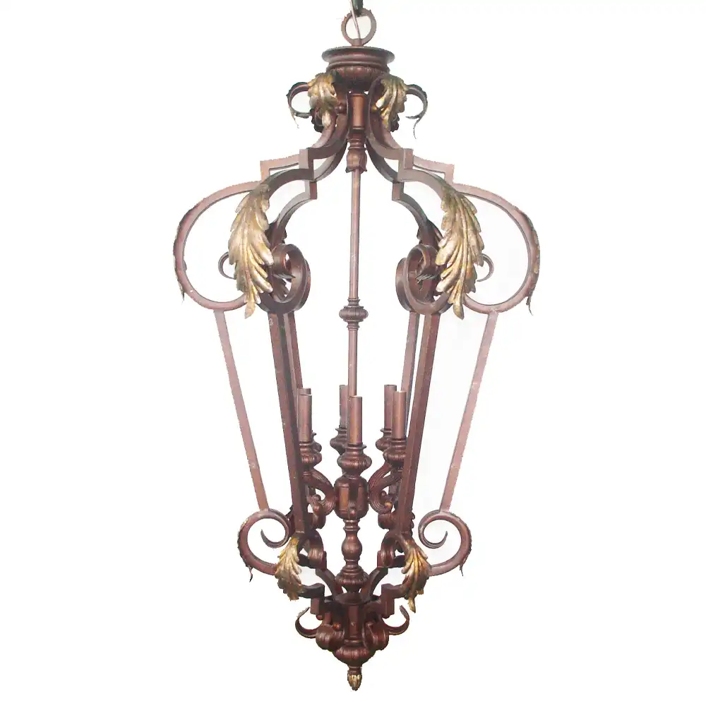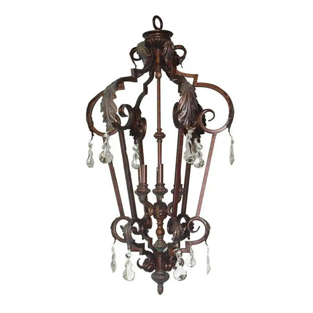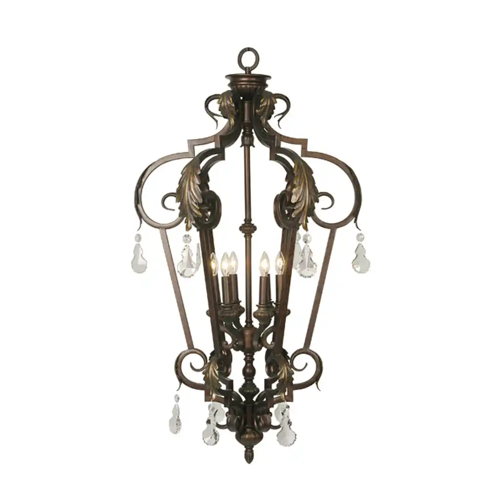 This 6-light pendant chandelier combines traditional artistry with refined sophistication. Crafted from high-strength wrought metal, the fixture displays a meticulously hand-applied antique bronze finish with soft golden undertones, giving it a timeless patina reminiscent of classic European design. The graceful open-frame lantern silhouette is adorned with hand-forged scrolls and sculpted leaf motifs, highlighted by clear crystal drop accents that add a touch of brilliance and light refraction.