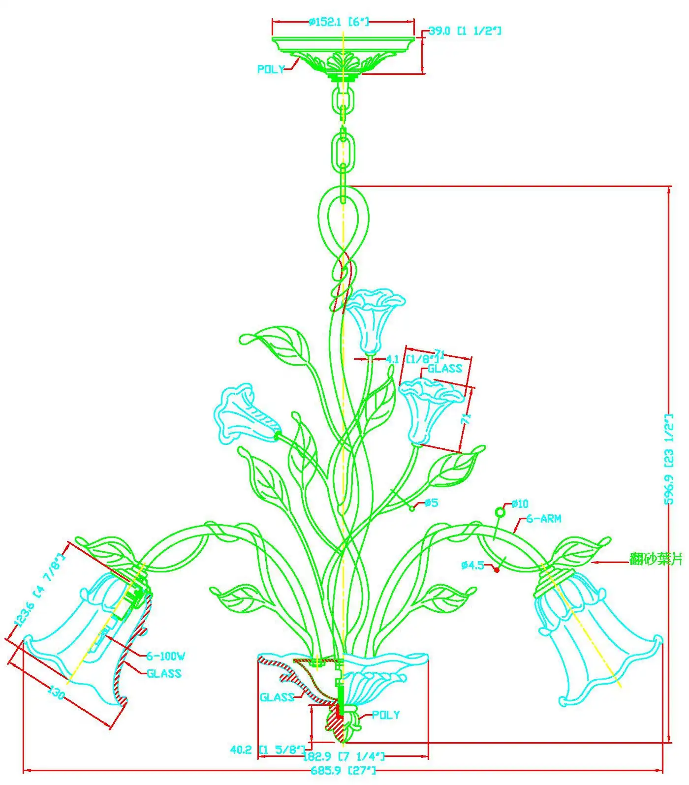 The chandelier’s design is inspired by blooming flowers and organic vines, with gracefully curved stems, detailed sculpted leaves, and six hand-blown glass shades shaped like delicate blossoms. The glass shades, with softly ruffled edges and amber-to-clear gradient tones, create a warm and inviting glow, diffusing light beautifully across any interior.