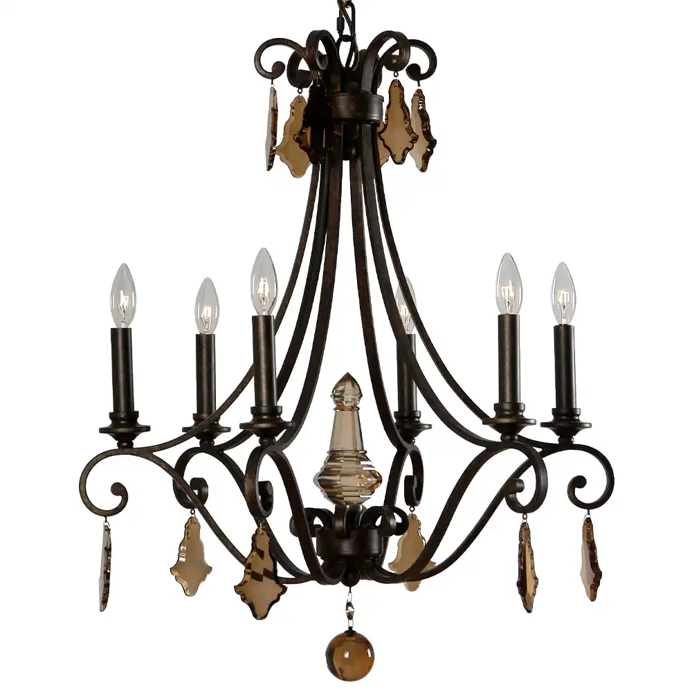 The Ambré 6-Light Chandelier harmoniously blends traditional European charm with handcrafted artistry. Constructed from high-strength wrought metal, this chandelier showcases a gracefully curved frame finished in a Rustic Bronze Patina — a meticulously hand-applied surface treatment featuring deep espresso undertones brushed with subtle copper highlights. The result is a warm, textured finish that evokes both strength and sophistication.
