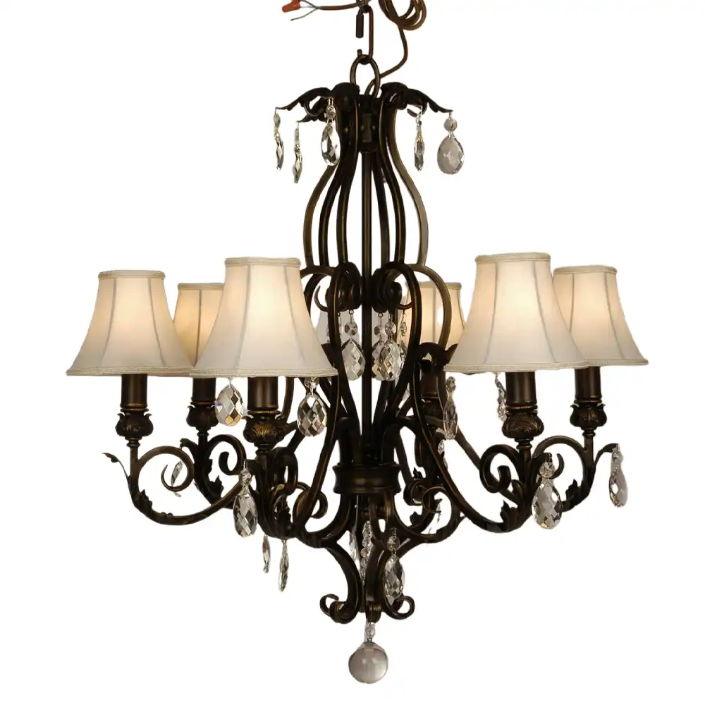 The Antique Bronze 6-Light Chandelier with Crystal Accents and Fabric Shades is a striking fusion of classic elegance and artisanal craftsmanship. Hand-forged from high-strength metal, this chandelier features graceful scroll arms, refined detailing, and hand-applied finishes that convey a timeless sense of luxury.