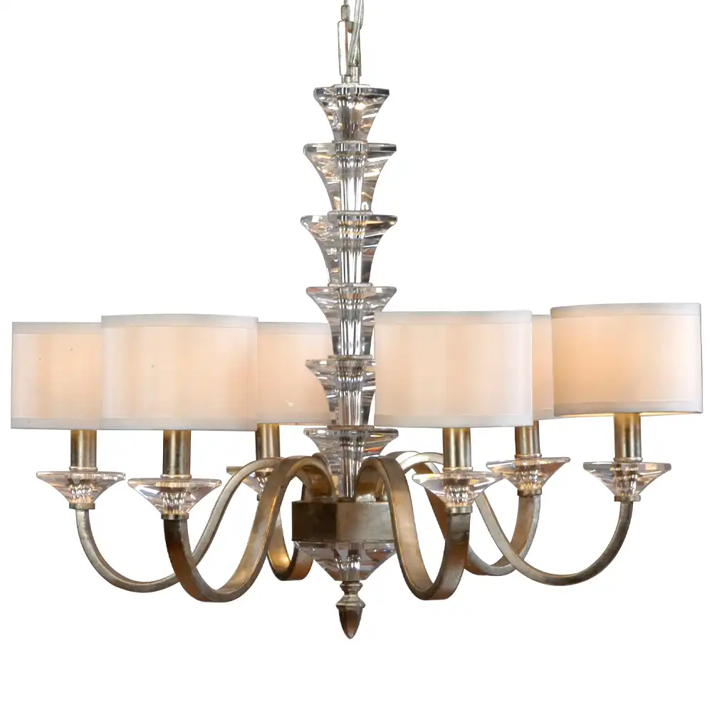 The fixture features a gracefully tiered crystal centerpiece, delicately layered to reflect light with dazzling clarity. Each of the six gently curved arms is crafted from high-strength metal, finished in an exquisite antique champagne gold — a subtly brushed tone that merges warm metallic hues with a soft satin sheen. The composition is completed with clear crystal bobeches and elegant white fabric drum shades, which diffuse a warm, ambient glow.