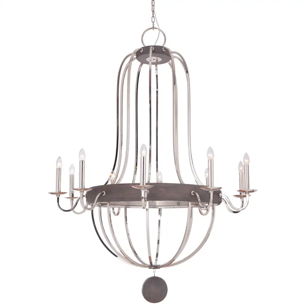 The Arden 10-Light Chandelier showcases the perfect balance between modern sophistication and organic warmth. Expertly handcrafted, this statement fixture combines a high-strength metal frame in a Polished Nickel finish with authentic weathered ash wood accents, creating a timeless yet contemporary aesthetic.