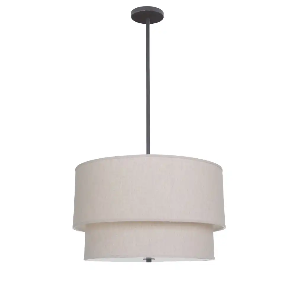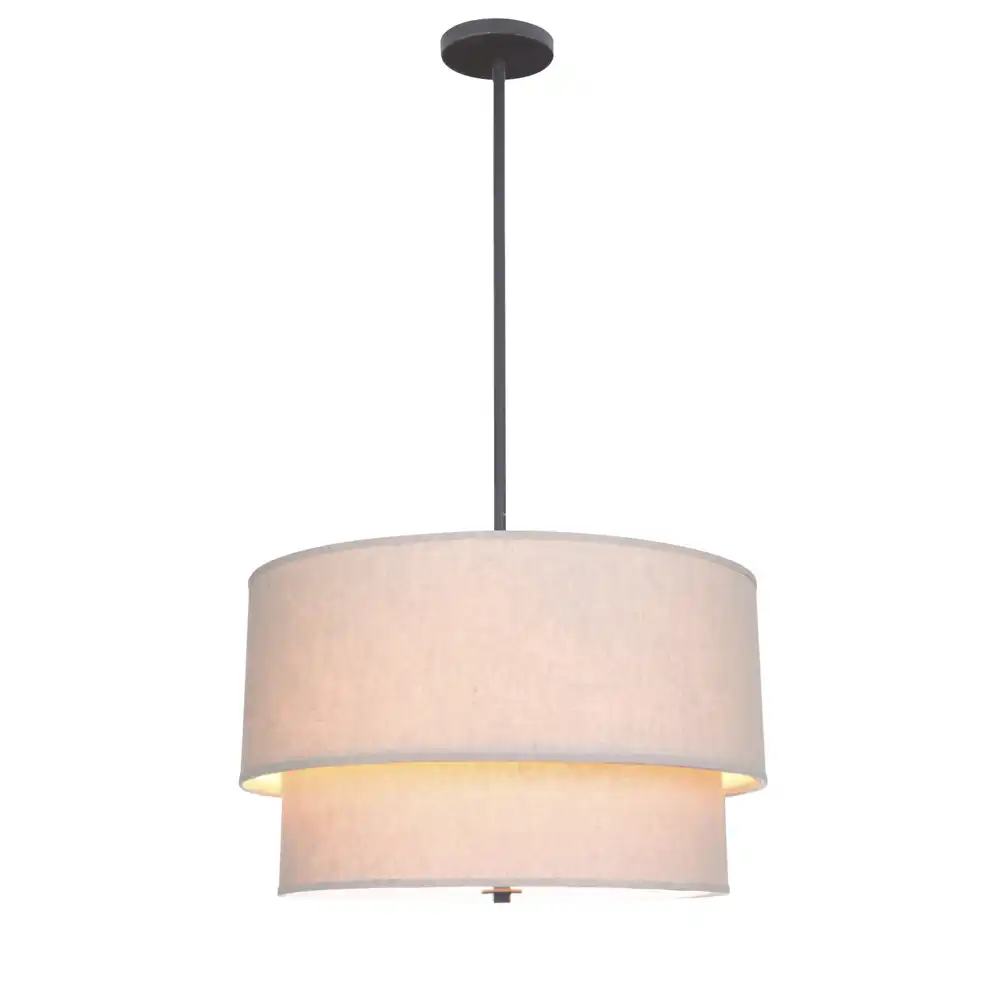 Its distinctive two-tier fabric drum shade in a soft linen beige tone diffuses the light beautifully, creating a warm, inviting glow suitable for dining rooms, lounges, hotel lobbies, or meeting areas. The clean geometric structure combined with the layered fabric texture gives this pendant an effortlessly sophisticated aesthetic.