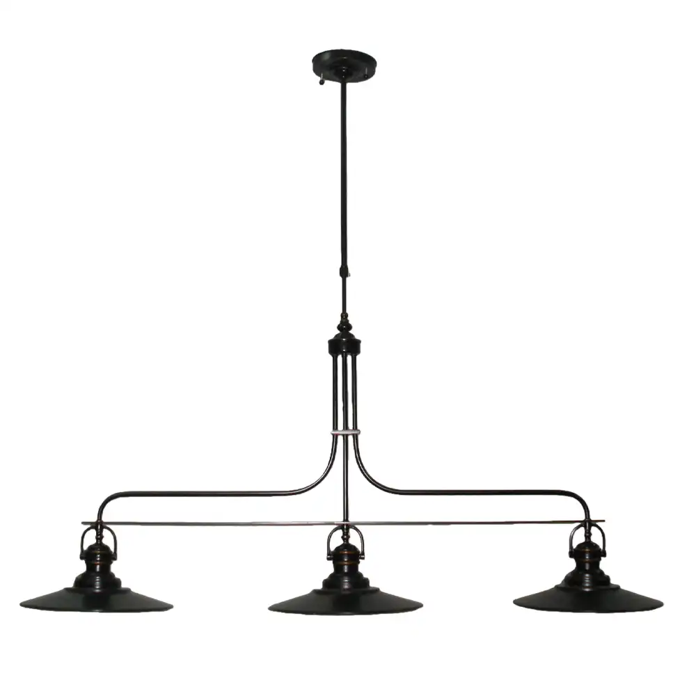 Featuring a clean, linear frame with three wide metal shades, this pendant delivers directed illumination that’s perfect for kitchen islands, dining bars, billiard rooms, or commercial environments. Its minimal silhouette and smooth metal tubing reflect the precision of modern design while maintaining a warm, authentic character that complements various interior themes — from rustic lofts to contemporary cafes.
