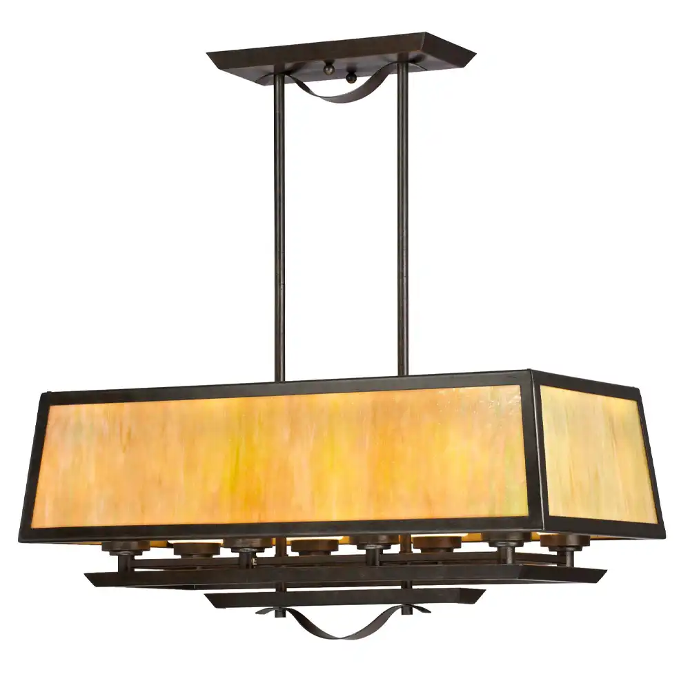 The rectangular frame houses eight cup-shaped amber glass lampshades, each crafted from textured art glass that diffuses a warm, inviting glow. The gentle amber tones evoke a natural, sunset-like radiance, balancing strength and warmth in perfect harmony. Vertical supports and clean lines lend the design a modern craftsman aesthetic, blending classic and contemporary styles seamlessly.