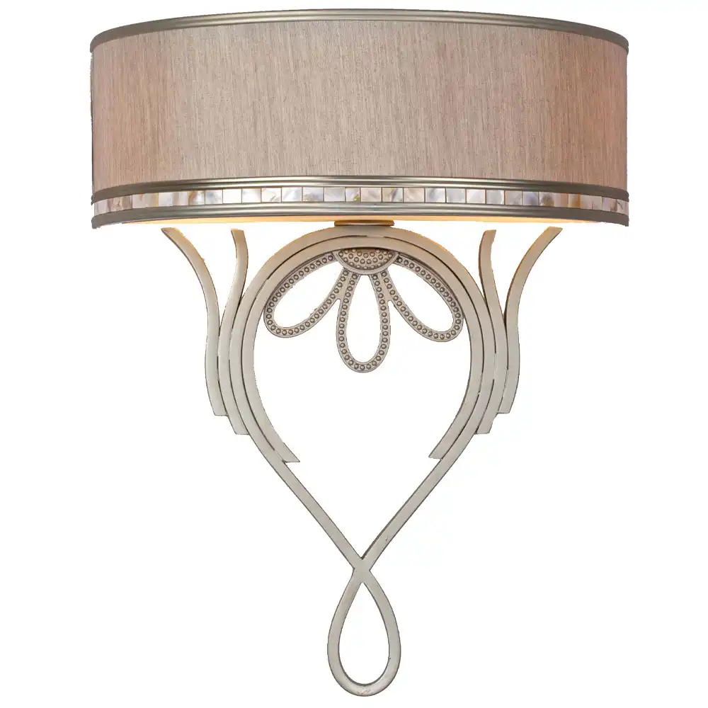 This two-light wall sconce is constructed from robust, high-strength metal, ensuring a stable structure that is built to withstand time and provide long-term compatibility. The delicate hand-applied pearl white finish offers a soft, luminous appearance with subtle iridescence, beautifully complementing the champagne linen and natural oyster shells. This durable finish, combined with the ornate stylized floral or heart-shaped metal framework with beaded accents, an elegant drum shade wrapped in champagne linen with a band of inlaid oyster shell tiles, and two internal lights (bulbs not included), creates an artistic and powerful presence. The linen shade provides soft, diffused light, while the oyster shell inlay adds a subtle, natural shimmer, enhancing a grand and stylish atmosphere with refined elegance.