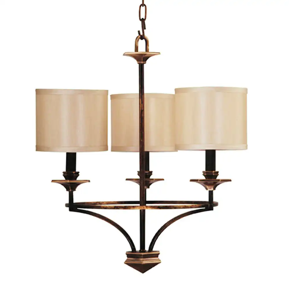 The surface showcases a hand-applied antique bronze finish with warm golden undertones, subtly brushed to reveal depth and texture. This refined finish beautifully complements the soft ivory fabric drum shades, creating a sophisticated interplay of metal and fabric that diffuses light with warmth and grace.