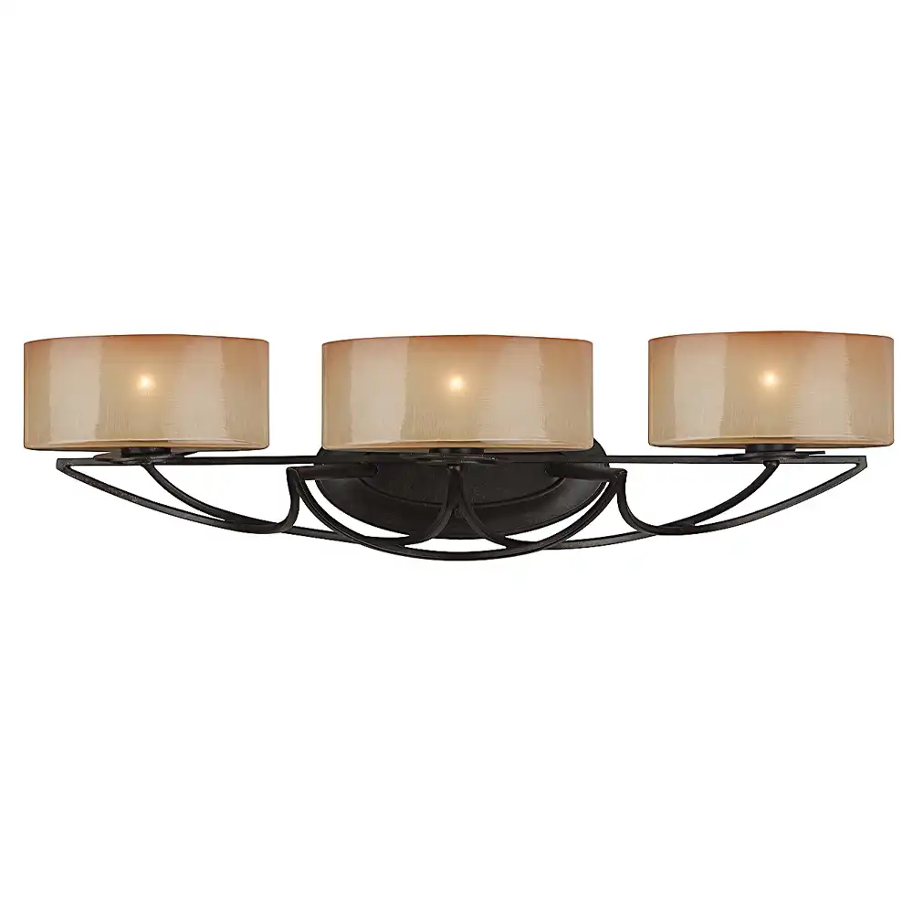 This three-light wall lighting fixture is constructed from robust, high-strength metal, ensuring a stable structure that is built to withstand time and provide long-term compatibility. The distinguished hand-applied distressed iron finish offers a muted, aged metallic appearance with subtle textural variations, providing an authentic, time-worn aesthetic that beautifully complements exposed brick, natural wood, and warm color palettes. This durable finish, combined with the central circular backplate, an expansive frame of interconnected, looping scrollwork, and three prominent bell-shaped ombre glass shades (bulbs not included), creates an artistic and welcoming presence. The unique ombre glass shades transition from a lighter, frosted top to a warm amber base, beautifully diffusing the light and creating a gentle, luminous, and inviting ambient glow that is perfect for enhancing a cozy and stylish atmosphere with refined elegance.