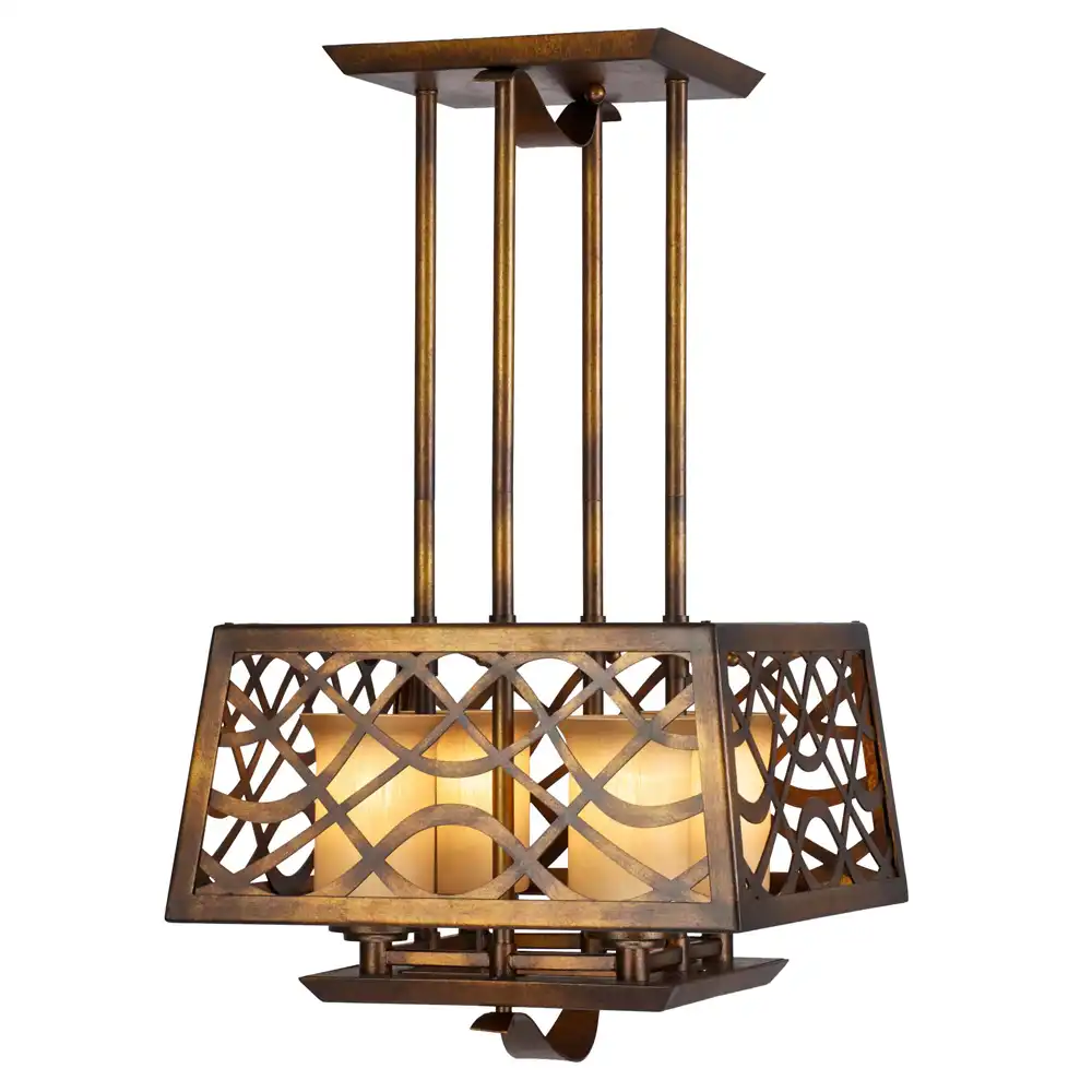 Within this striking metal cage, four cup-shaped amber glass lampshades diffuse a warm, inviting glow, creating an ambiance of comfort and luxury. The amber hue of the glass is carefully chosen to complement the bronze finish, enhancing the fixture’s overall warmth and creating a soft, welcoming illumination ideal for various settings from residential to commercial.