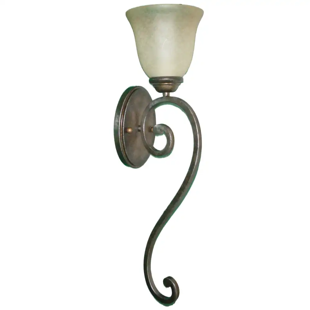 This single-light wall sconce is constructed from robust, high-strength metal, ensuring a stable and sturdy structure that is built to withstand the test of time. The distinguished aged pewter (or distressed dark silver/grey) finish offers a cool, rustic tone with subtle aged highlights, providing an authentic and versatile aesthetic that complements a wide range of modern and traditional color palettes and design schemes. This elegant finish, combined with the dramatically sweeping and gracefully curved metal arm, creates an artistic and captivating presence, reminiscent of a delicate vine or a calligraphic flourish. A single inverted bell-shaped frosted marbleized (or mottled alabaster-style) glass shade diffuses light softly and evenly, creating a warm, ambient glow perfect for hallways, living rooms, bedrooms, or as a charming accent in any space seeking a blend of artistic design and inviting light.