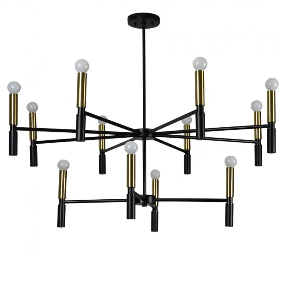 Striking 12-light Sputnik chandelier with matte black and brushed brass finish. Mid-century modern inspired, customizable for B2B/OEM/ODM projects.