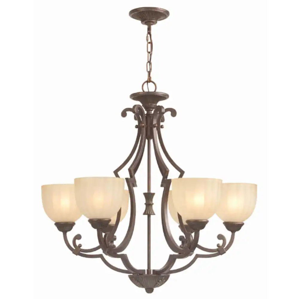 Antique patina copper 6-light pendant with curved tube structure and textured white cloudy glass shades. Fully customizable for OEM/ODM wholesale applications.