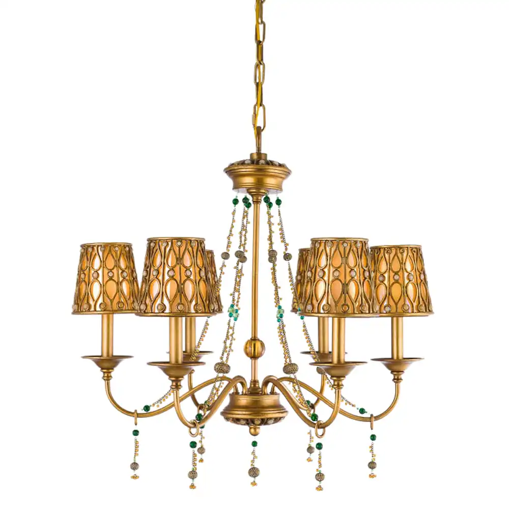 Elegant 6-light chandelier with brushed antique gold finish, patterned gold lampshades, and crystal bead accents. Handcrafted for luxury interiors and fully customizable for OEM/ODM decorative lighting projects.