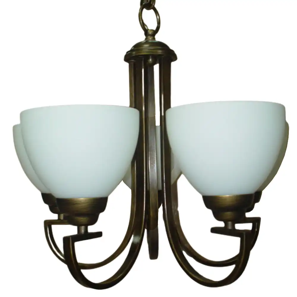 5-Light antique brass chandelier featuring frosted glass lampshades and curved rectangular stems. OEM/ODM-ready for custom lighting projects and wholesale applications.