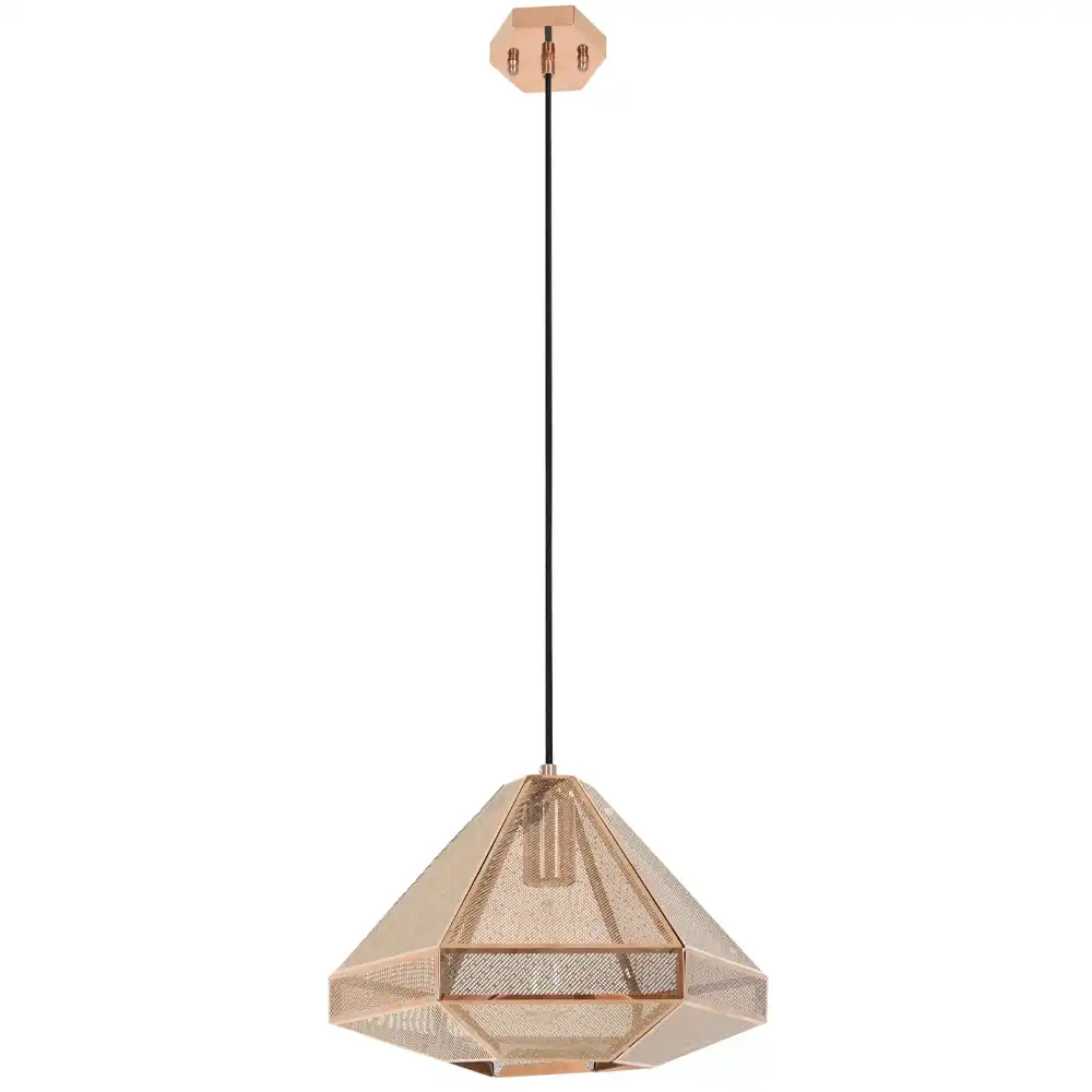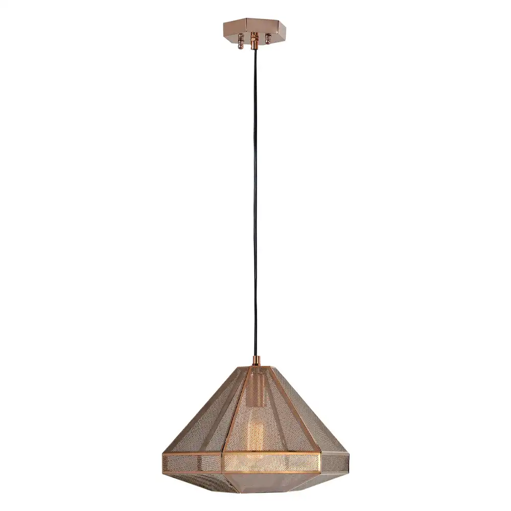 The fixture features a brushed rose gold electroplated finish with a subtle metallic sheen — a luxurious tone that blends the warmth of copper with the elegance of modern gold. The geometric mesh shade introduces texture and visual depth, allowing light to diffuse through fine perforations to create a captivating interplay of shadows and ambient glow.