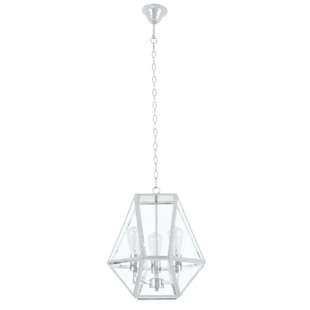 The Aurora Prism 3-Light Pendant Light features a geometric metal frame in a mirror-polished chrome finish with clear glass panels, combining modern minimalism with handcrafted precision — ideal for OEM/ODM decorative lighting projects.