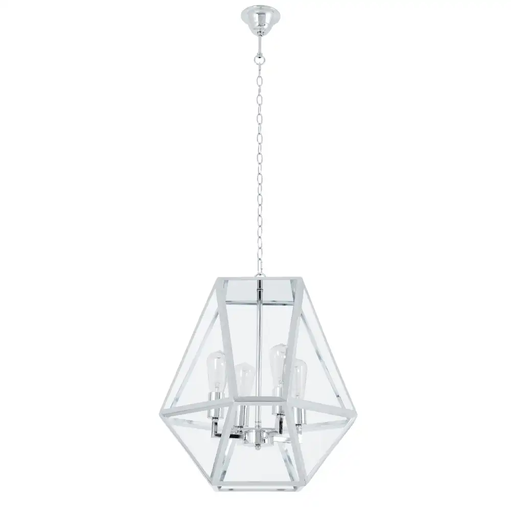 Its geometric cage design, composed of angular metal beams and clear glass panels, creates a striking interplay of light and shadow while maintaining a sense of openness. Inside, four exposed bulb sockets offer a nod to classic elegance, enhanced by the crisp modernity of the chrome framework.