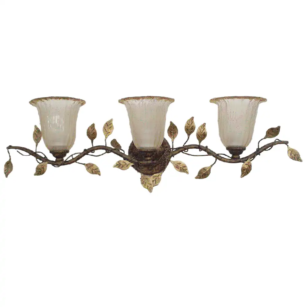 This three-light vanity light is constructed from robust, high-strength metal, ensuring a stable structure that is built to withstand time and provide long-term compatibility. The distinguished hand-applied bronze finish offers a deep, earthy tone that serves as a perfect base for the delicate, hand-applied gold leaf accents on the numerous leaves, creating a stunning visual contrast. This durable finish, combined with the central ornate backplate, the gracefully sculpted horizontal branch-like bar adorned with intricate vine scrollwork and leaf details, and the three prominent frosted, scalloped-edge bell-shaped glass shades, creates an artistic and welcoming presence. The frosted glass, with its delicate scalloped rim, beautifully diffuses the light (bulbs not included), creating a soft, ambient glow that is perfect for providing ample and glare-free illumination for grooming tasks or enhancing a serene atmosphere.