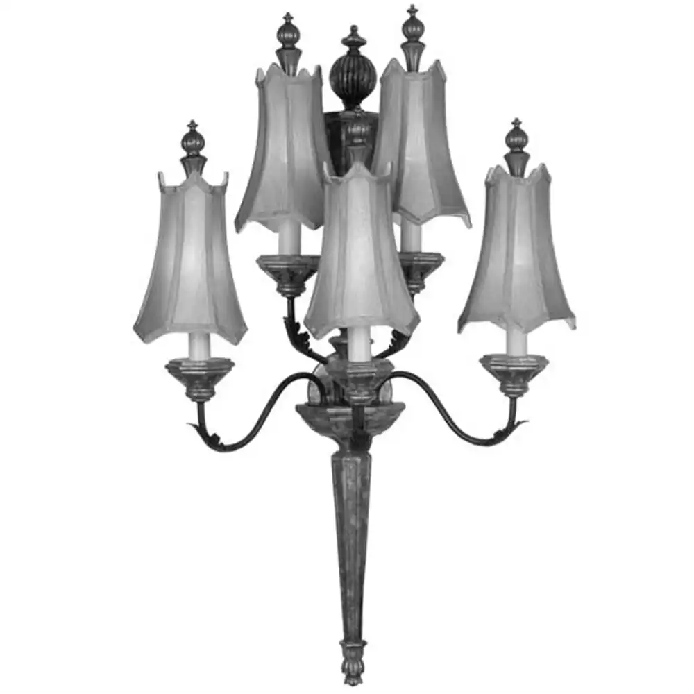 Grand 5-light wall sconce with a handcrafted distressed gilded bronze finish, ornate finials, and five cream fabric bell shades. Features a baroque traditional design.