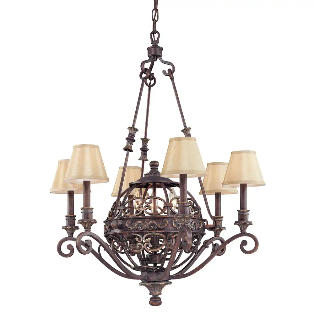 Harmonious Blend of Finish and Texture: The “Baroque Orb” chandelier boasts a meticulously applied hand-applied distressed bronze finish with subtle gold and copper antiquing. This complex finish begins with a deep, rich bronze base, reminiscent of centuries-old forged iron, which is then artfully distressed to reveal lighter, burnished gold and coppery undertones. These subtle metallic highlights catch the light, emphasizing the intricate scrollwork and filigree, bestowing an authentic, aged character. The metalwork is perfectly complemented by six elegant cream-colored linen shades, which soften the light and add a touch of refined warmth and texture.