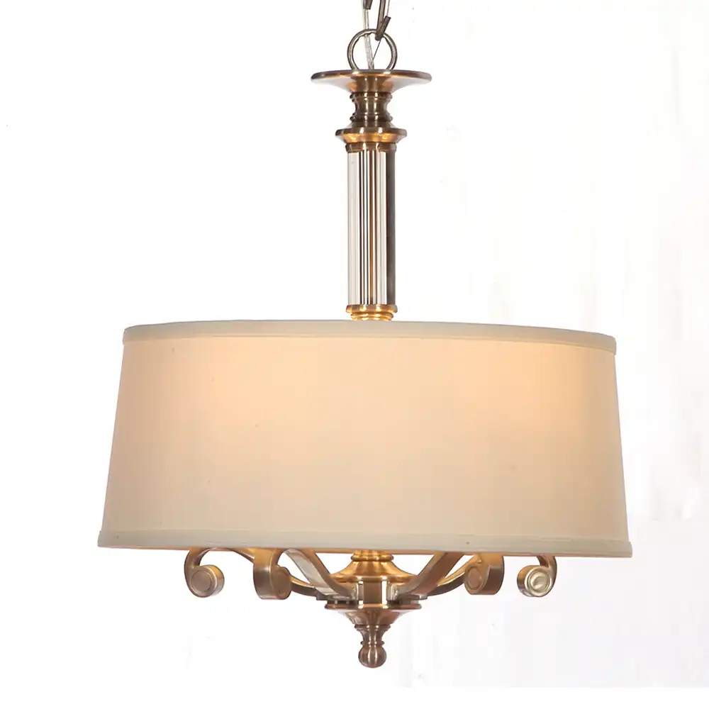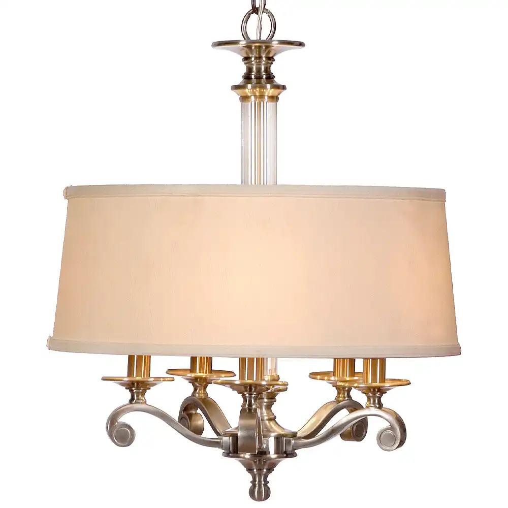 The chandelier features a dual-finish composition: a brushed nickel body with antique brass accents, creating a subtle interplay between cool and warm metallic tones. The brushed nickel offers a soft satin sheen that reflects light gently without glare, while the antique brass highlights introduce depth and a touch of classic warmth. A clear ribbed glass column at the center adds dimension and grace, complementing the luminous fabric drum shade that diffuses light evenly for a soft, inviting glow.