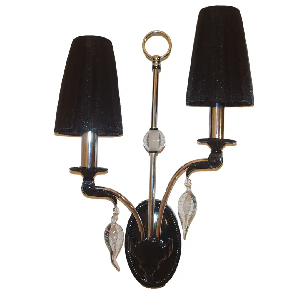 Introduce a touch of sophisticated drama and balanced, inviting illumination to your interiors with our Black Tie Affair Chrome & Black 2-Light Wall Sconce with Crystal Accents. Meticulously handcrafted at our professional decorative light fixture factory in China, this exquisite wall lighting piece embodies a profound understanding of transitional, glamorous, and contemporary interior design. It seamlessly blends high-strength metal with a brilliant polished chrome finish and a striking black lacquered backplate, adorned with a central crystal sphere, two elegant black fabric cone shades, and suspended clear glass leaf drops. Designed for enduring beauty, stability, and long-term reliability, it’s an ideal selection for discerning designers and end-users seeking distinctive, artistic, and functionally superior lighting solutions for bedrooms, hallways, dining rooms, or any space desiring a sleek, upscale accent.