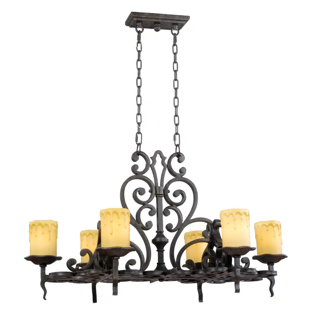 The Castello 6-Light Hand-Forged Iron Chandelier embodies the grandeur and artistry of traditional European craftsmanship. Expertly handcrafted from high-strength wrought iron, this fixture showcases a hand-applied Antique Bronze finish with subtle gold-bronze undertones. The surface is carefully patinated to reveal variations of dark espresso brown and aged bronze, with soft metallic highlights that enhance the intricate scrollwork and forged details.