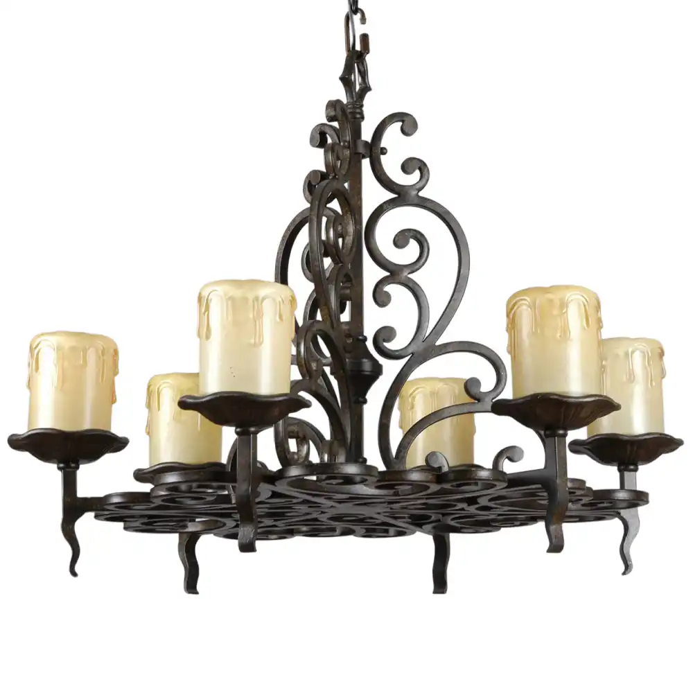 Each of the six lamp holders features a sculpted faux-wax candle glass shade, designed to mimic the romantic glow of melting candlelight — a timeless tribute to old-world illumination. The gracefully curved iron arms, elaborate scroll motifs, and decorative base demonstrate exceptional hand-forging techniques, combining strength and elegance in a beautifully balanced composition.