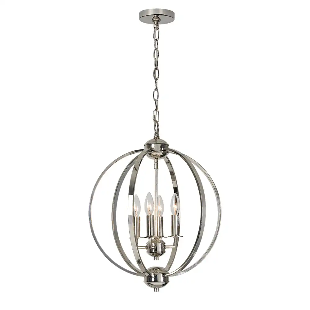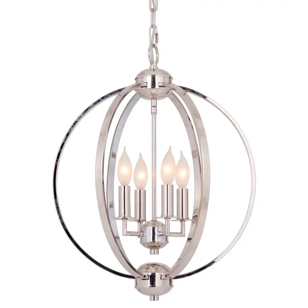 Elegant 4-light open-orb chandelier in brilliant Polished Nickel finish. Handcrafted high-strength metal. Fully customizable for B2B/OEM/ODM projects, ideal for modern upscale interiors.