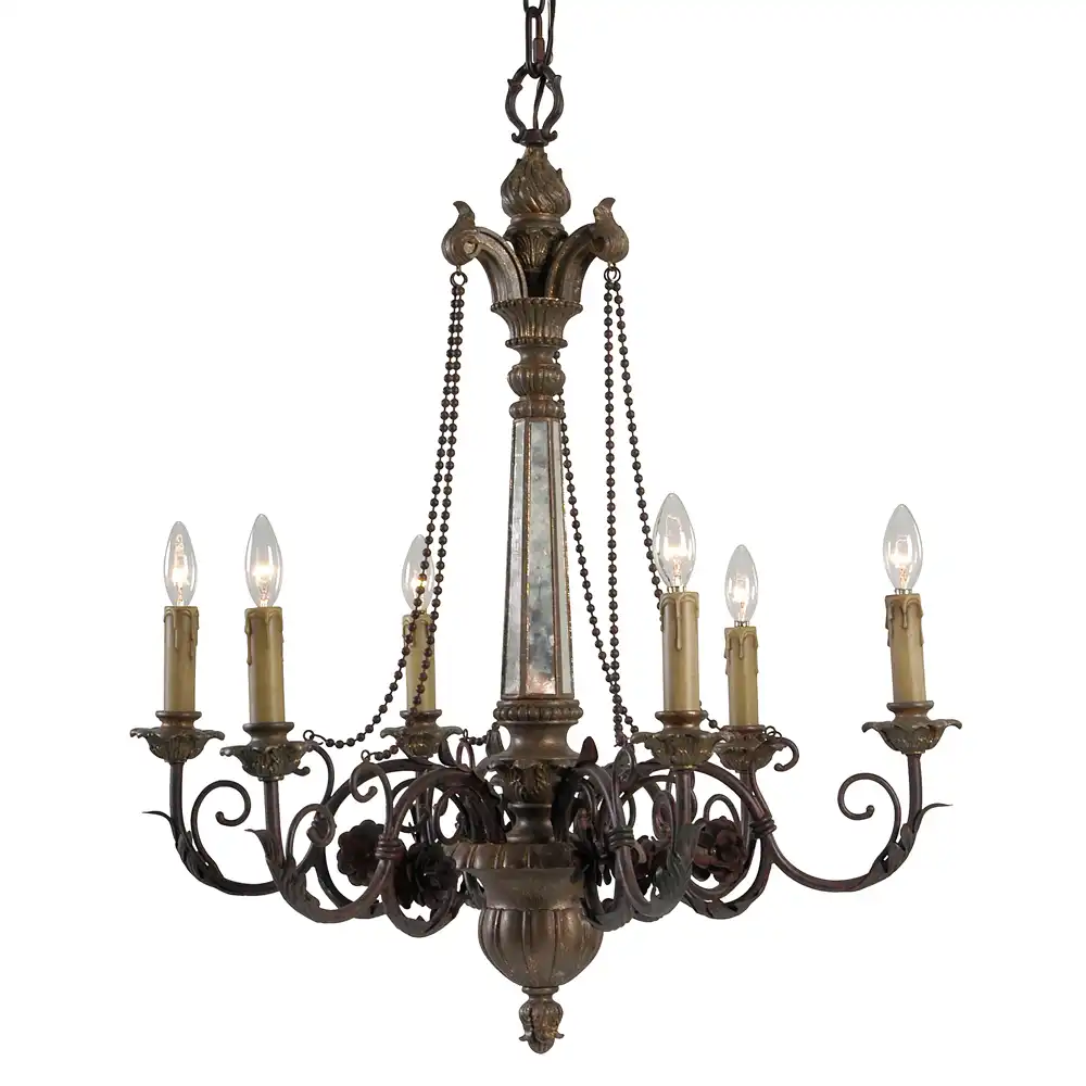 This charming 6-light fixture is designed with a magnificent central column, from which six gracefully curved arms extend outwards. Each arm supports a light holder, designed to present a classic candle-style bulb, complete with a decorative “wax drip” sleeve, for an authentic historical ambiance. Fine metal chains draped between the upper decorative elements and the light arms add another layer of intricate detail and texture. The metalwork throughout the fixture is adorned with subtle floral and leaf motifs, further enhancing its handcrafted and organic appeal.