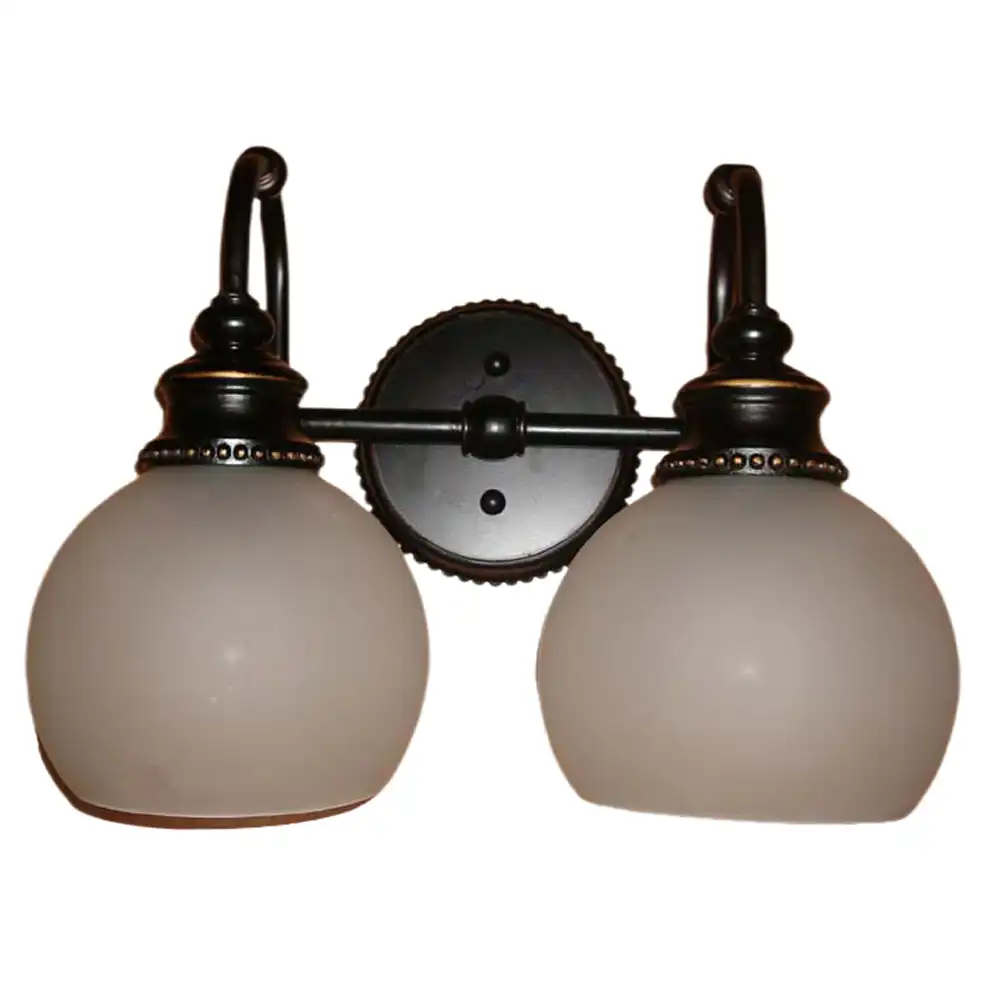 This two-light wall lighting fixture is constructed from robust, high-strength metal, ensuring a stable structure that is built to withstand time and provide long-term compatibility. The distinguished hand-applied rubbed bronze finish offers a deep, rich brown with subtle metallic highlights, providing an authentic, time-worn aesthetic that beautifully complements natural wood, stone accents, and warm color palettes. This durable finish, combined with the classic round backplate, the horizontal bar with graceful upward-curved arms, decorative beaded accents around the shade holders, and the two prominent frosted glass bell shades (bulbs not included), creates an artistic and welcoming presence. The soft frosted glass shades beautifully diffuse the light, creating a gentle, luminous, and inviting ambient glow that is perfect for enhancing a cozy and stylish atmosphere.
