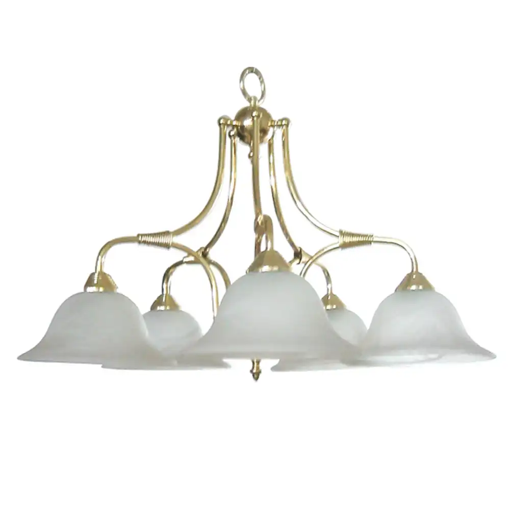 Elegant 5-light pendant in polished brass with alabaster glass shades. Handcrafted for durability and timeless appeal, ideal for OEM/ODM and B2B wholesale lighting projects.