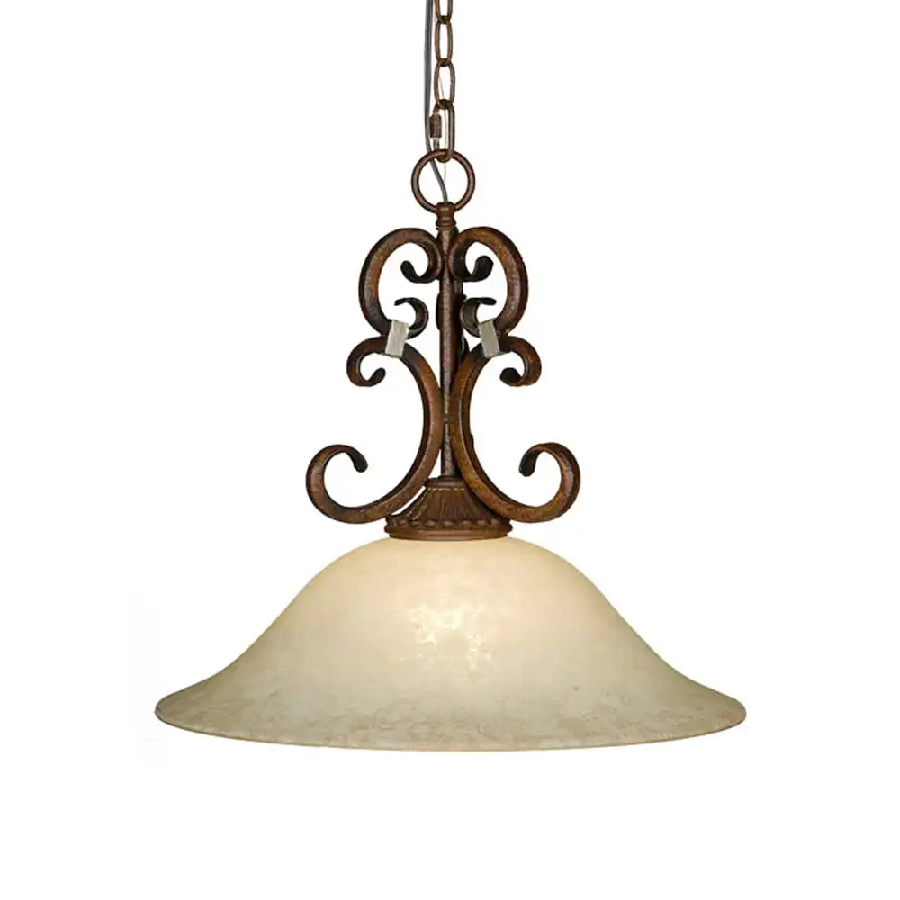 The Classic Scroll Iron Pendant Light exemplifies timeless craftsmanship and elegant metalwork. This pendant features an intricately hand-forged scroll design crafted from high-strength wrought iron, ensuring exceptional durability and structural integrity. The finish is a hand-applied burnished bronze with subtle gold undertones, giving it a refined patina that beautifully complements the warm, marbled glass shade. The combination of rustic texture and graceful curves brings sophistication and warmth to dining rooms, living spaces, or entryways.