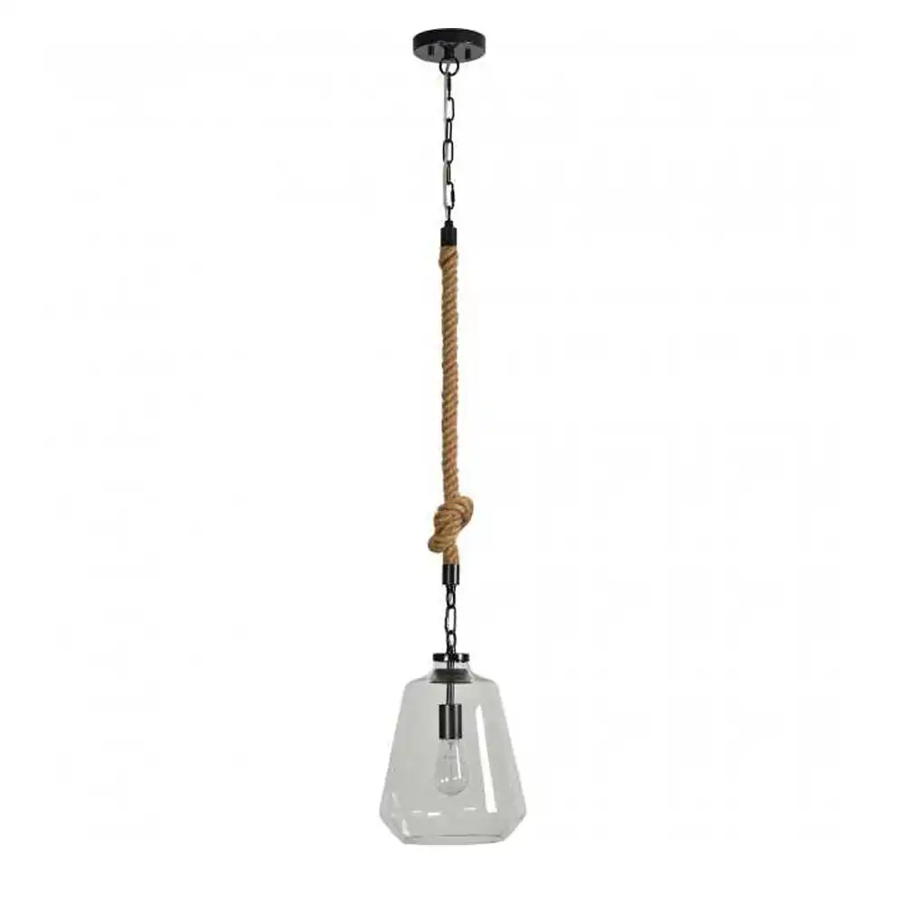 The defining feature of this pendant is its genuine natural jute rope suspension, artfully tied with a decorative knot, imbuing the fixture with an authentic nautical or modern farmhouse appeal. This textured rope provides a warm, organic contrast to the clean lines and clear glass. The rope gracefully transitions to a distinctive, hand-blown clear glass shade with a unique, faceted or subtly irregular silhouette, reminiscent of sea-tumbled glass. This exquisite glass design not only protects the bulb but also refracts and disperses light beautifully, creating a welcoming and ambient glow.