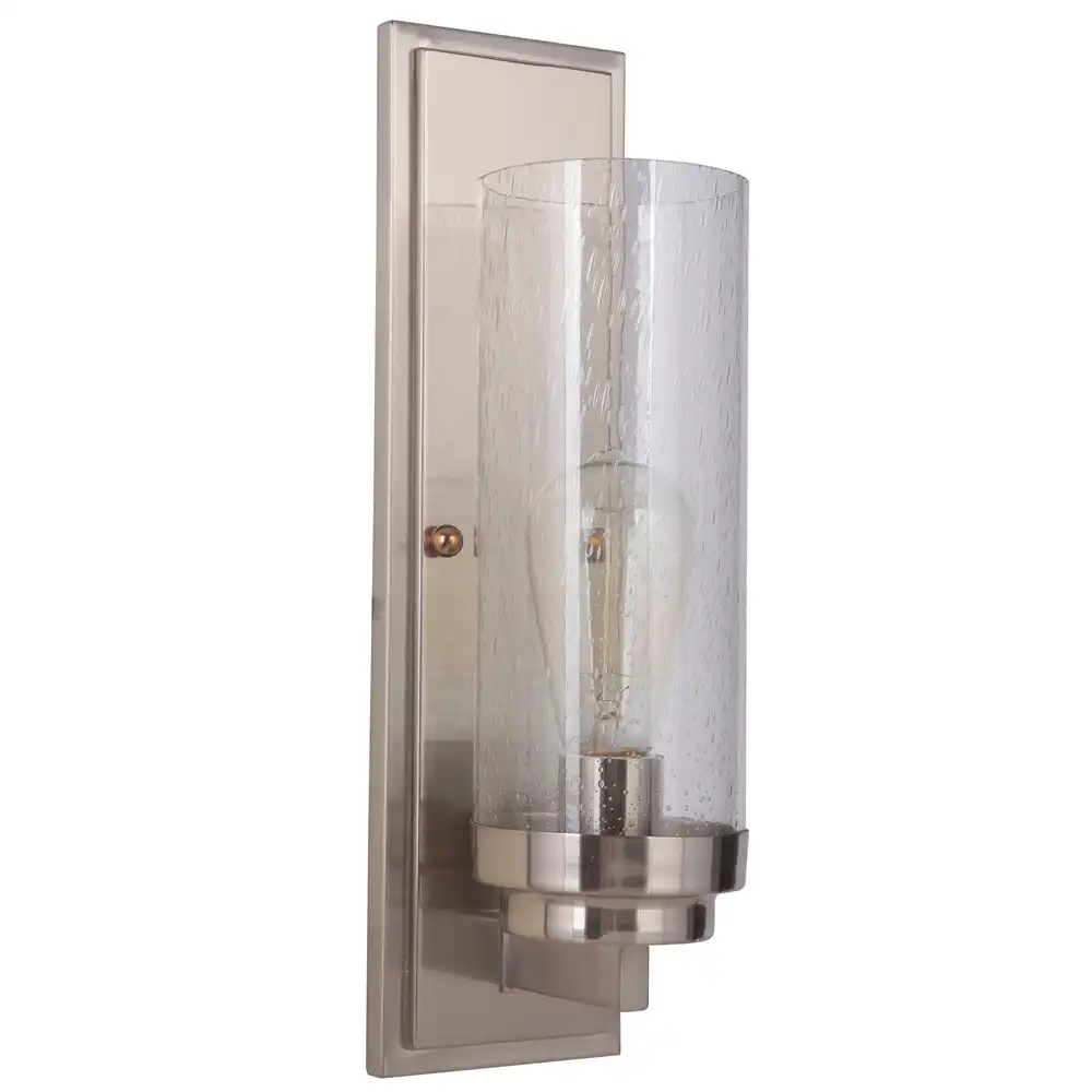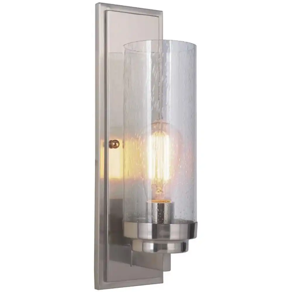This single-light wall sconce is constructed from robust, high-strength metal, ensuring a stable structure that is built to withstand time and provide long-term compatibility. The sleek brushed nickel finish provides a modern, understated metallic sheen, offering a versatile and sophisticated aesthetic that complements a wide range of contemporary decor and color schemes. This durable finish, combined with the clean lines of the rectangular backplate and the tiered support, and the prominent seeded clear glass cylinder shade, creates an artistic and powerful presence. The seeded glass, with its subtle air bubbles, adds a unique visual texture reminiscent of artisanal craftsmanship, while allowing for maximum, slightly diffused light (bulb included as shown, ideal for a decorative Edison-style bulb), perfect for task lighting or ambient illumination.