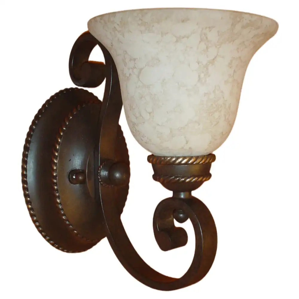 This single-light wall sconce is constructed from robust, high-strength metal, ensuring a stable and sturdy structure that is built to withstand the test of time. The distinguished aged bronze (or distressed dark bronze) finish offers a rich, warm tone with subtle aged patina, providing an authentic and classical aesthetic that complements a wide range of coastal, rustic, and traditional color palettes and design schemes. This elegant finish, combined with the rope-textured detailing on the round backplate and shade holder, and the gracefully scrolled metal arm, creates an artistic and captivating presence. A single inverted bell-shaped glass shade, featuring a beautiful mottled (or seeded) texture, diffuses light softly and evenly, creating a gentle, ambient glow perfect for hallways, living rooms, bedrooms, or as a charming accent in any space seeking a blend of classic design and seaside inspiration.