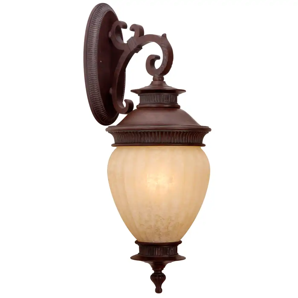 This single-light outdoor wall lantern is constructed from robust, high-strength metal, ensuring a stable and sturdy structure that is built to withstand the rigors of outdoor elements. The distinguished cast bronze (or dark aged bronze) finish offers a rich, deep tone with subtle highlights, providing a classic and authoritative aesthetic that complements a wide range of architectural styles and exterior color palettes. This elegant finish, combined with the detailed tiered finial, fluted accents on the canopy and base, a decorative scrolled arm, and an urn-shaped body, creates a majestic and timeless presence. A single, large urn-shaped glass shade, featuring a beautiful vertical ribbed (or fluted) texture, diffuses light softly and warmly, casting an inviting, ambient glow perfect for illuminating entryways, defining architectural features, or enhancing the aesthetic appeal of your outdoor living areas.