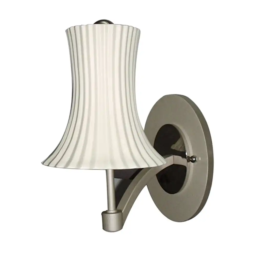 This single-light wall sconce is constructed from robust, high-strength metal, ensuring a stable and sturdy structure that is built to withstand the test of time. The distinguished brushed nickel finish offers a clean, contemporary aesthetic that complements modern fixtures and a wide range of sophisticated color palettes. This elegant finish, combined with the sleek circular backplate, gracefully curved arm, and subtle metallic accents, creates a sophisticated and artistic presence. A single uniquely shaped glass shade, featuring a beautiful fluted (ribbed) texture and a clean white finish, diffuses light softly and evenly, creating a warm, ambient glow perfect for hallways, living rooms, bedrooms, or as a chic accent in any contemporary space.