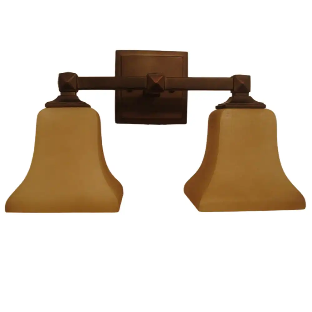 This two-light wall lighting fixture is constructed from robust, high-strength metal, ensuring a stable structure that is built to withstand time and provide long-term compatibility. The sophisticated matte black finish offers a refined, non-reflective surface that provides a striking contrast and complements a wide range of modern and traditional decor. This durable finish, combined with the clean lines of the square backplate, the straight horizontal bar with decorative pyramid-capped accents, and the two prominent amber-frosted glass bell shades (bulbs not included), creates an artistic and welcoming presence. The beautifully shaped glass shades with their warm amber tint diffuse the light, creating a gentle, luminous, and inviting ambient glow that is perfect for enhancing a cozy and stylish atmosphere.