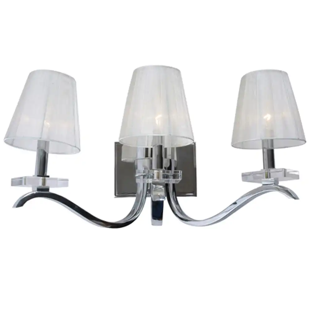 This three-light wall lighting fixture is constructed from robust, high-strength metal, ensuring a stable structure that is built to withstand time and provide long-term compatibility. The dazzling polished chrome finish offers a highly reflective, mirror-like surface that brings a bright, modern touch to any room. This durable finish, combined with the understated rectangular backplate, the gracefully curved “wave” arms, three prominent clear faceted crystal accents at the base of each light, and the three elegant sheer pleated fabric bell shades, creates a striking and versatile presence. The delicate pleated texture of the shades beautifully diffuses the light (bulbs not included), creating a soft, luminous, and inviting ambient glow, while the shimmering crystal elements add a captivating sparkle, perfect for enhancing a serene and stylish atmosphere with a touch of refined luxury.